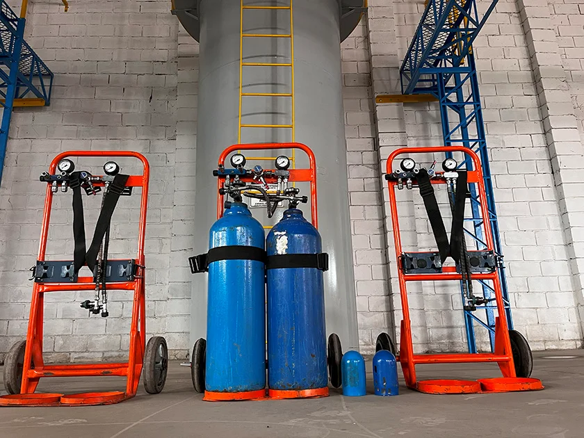 Em seguida, o ar é armazenado em cilindros ou tanques e distribuído por meio de mangueiras para os trabalhadores.